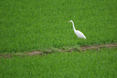 昨日は、用水路の水が田んぼに溢れ出していたが、今日は田んぼの中に小魚などが流れ込んでいたのだろう。多くのサギが田んぼで食料をあさっていた。