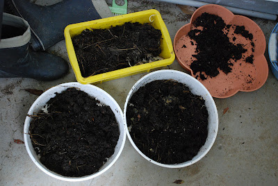 さて、堆肥はまだウェットな状態のままだったが、いつまでもこのままにしておくわけにはいかないので、最初チェックを初めて4日後の今日、小皿の堆肥とミミズを分別した。