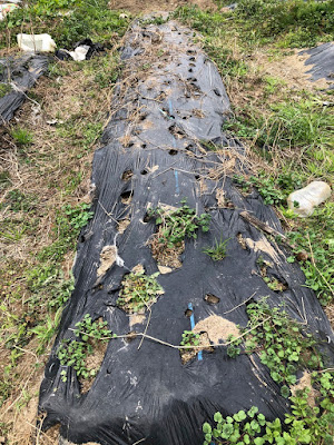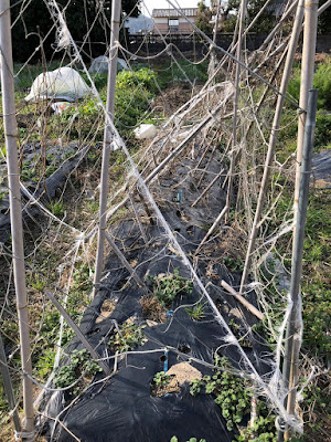 どちらの畝も、お役御免の状態で、竹支柱や鉄パイプ支柱、そしてノリ網を撤去することにした。