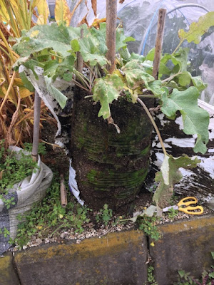 | 中には、こんな感じで全てのゴボウの苗が枯れて、惨めな姿の袋もある。 |