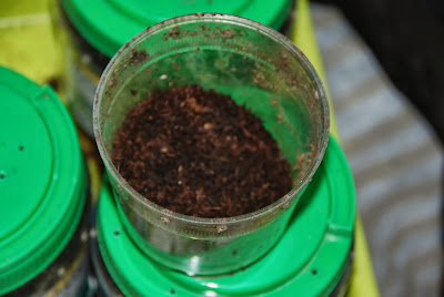 | この観察小屋はみみず君が30匹しかいなかったので容器が小さい。 緑の蓋が付いている通常サイズの観察小屋よりかなり小さな容器だった。 餌が食べられ、ボリュームが減っていたので暑さの影響を受け易かったのだろうか? |