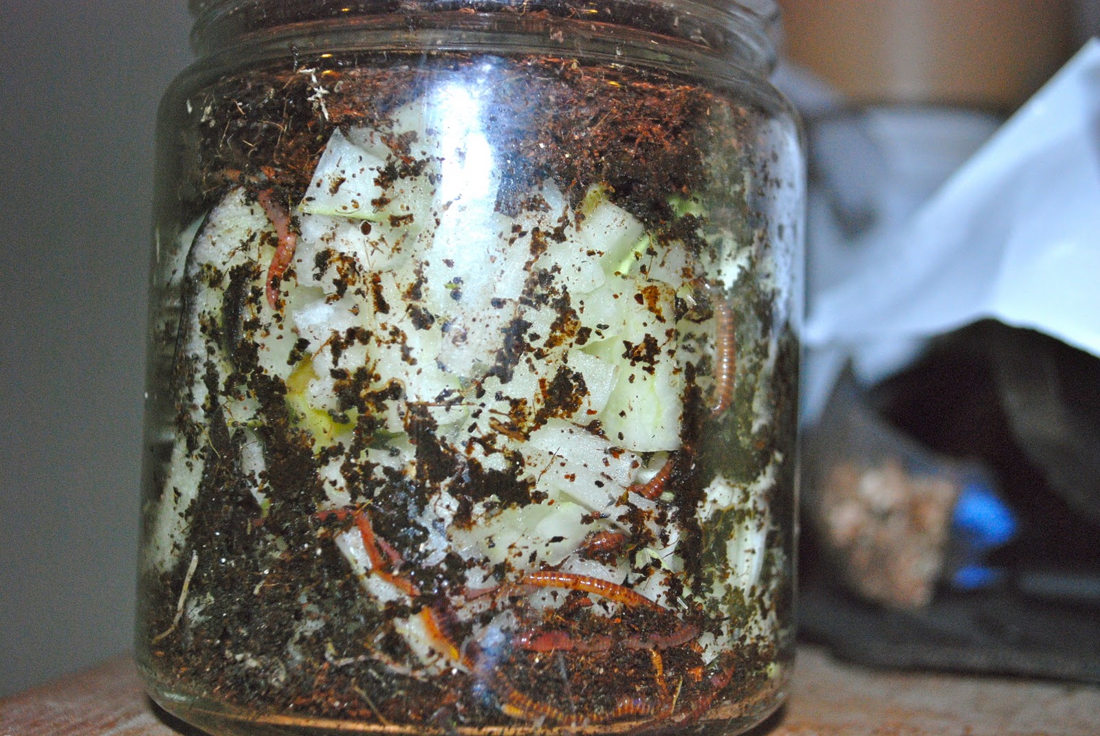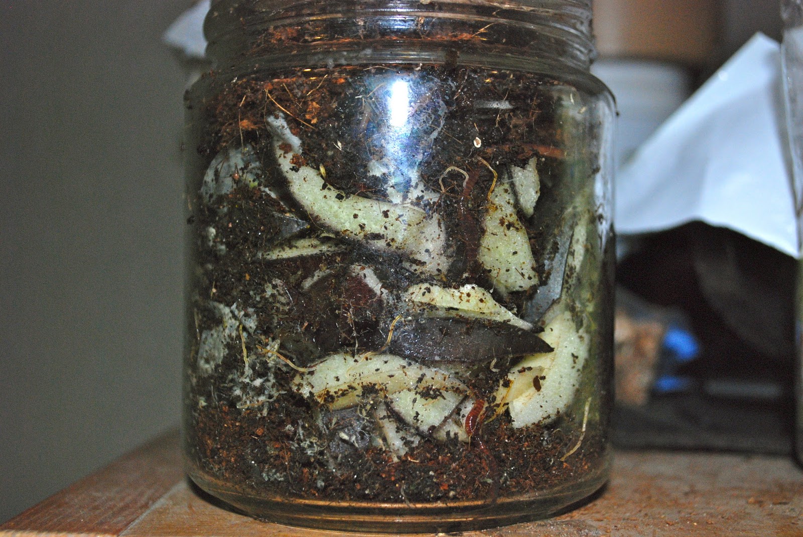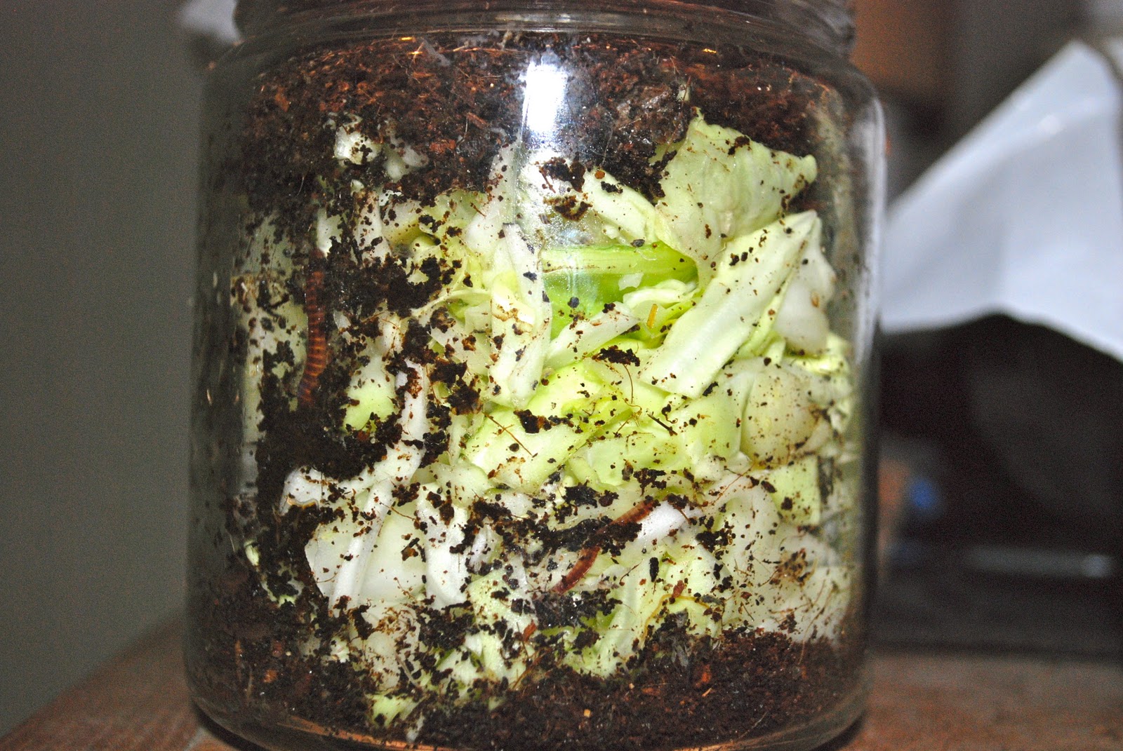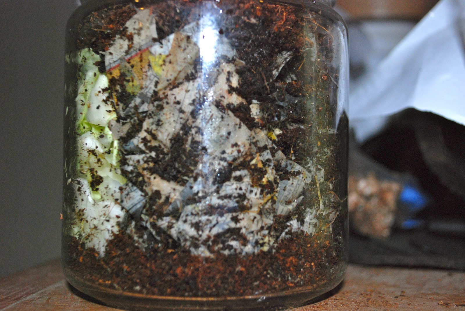 | この状態で段ボールを抜いてこれら食材の上に青年ミミズ中心に100匹程、ココナッツ繊維とともに投入した。 |