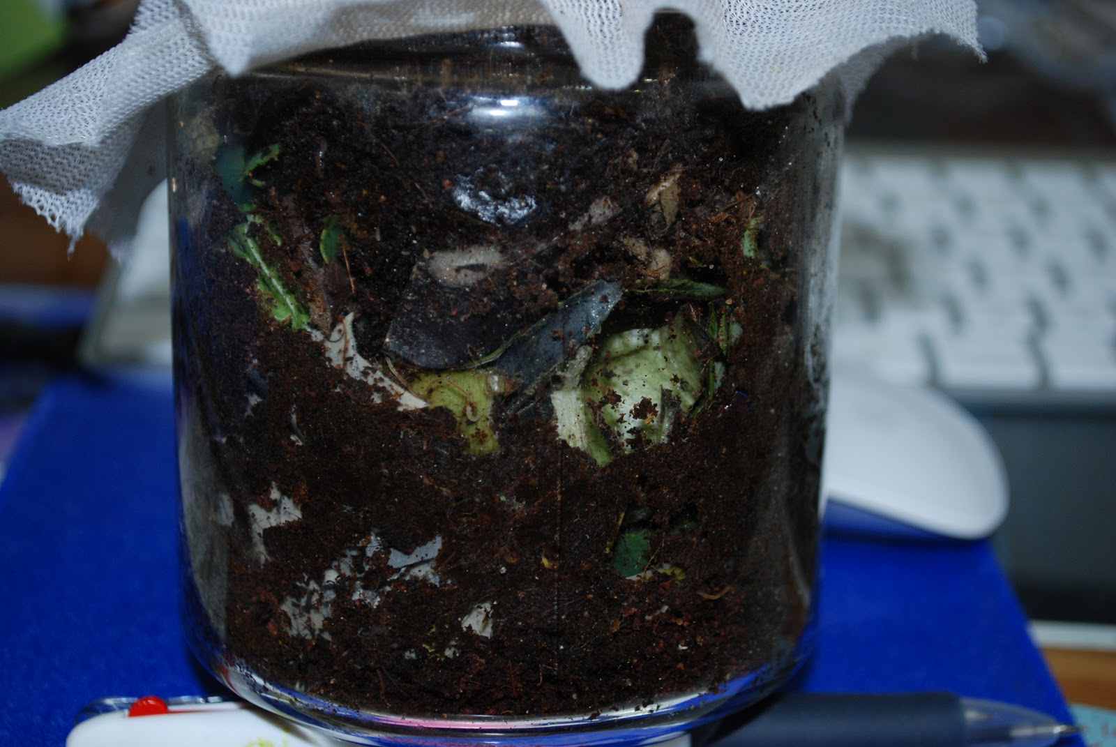 | 観察小屋1のリニューアル。みみず君100匹(内、大人ミミズは約30匹)入れたのだが、ガラス瓶の方にはほとんど寄ってきていない。環境に慣れてきたら黄緑色に見えている里芋の茎、ここはイガくて人間様は食べれないとのことだが、果たしてミミズ様は食べてくれるか?同時に投入されている新聞紙や里芋の葉との食べ方の違いも見てみよう。 |