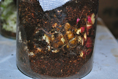 | 写真は下から時計回りに、サツマイモ、つくね芋。里芋(親芋)、キクイモ。すべて生。昨日と同じ要領で段ボールを外し上に約200匹の青年みみず君をココナッツ繊維とともに投入。 |