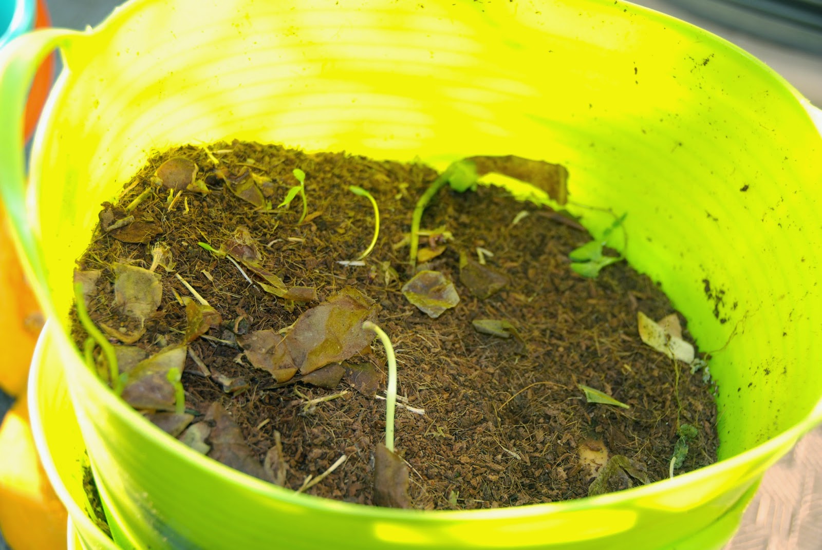 3段の柔らかいバケツと下に液肥溜めの容器(洗面器)が見える。