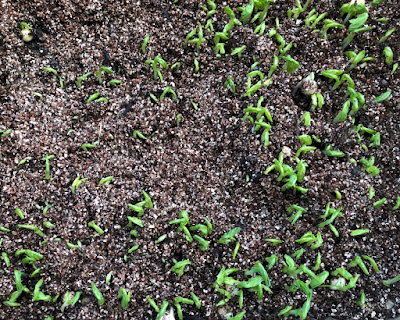 水耕栽培の容器にバーミキュライトを加えたものでは、まだ苗の姿もまばら。