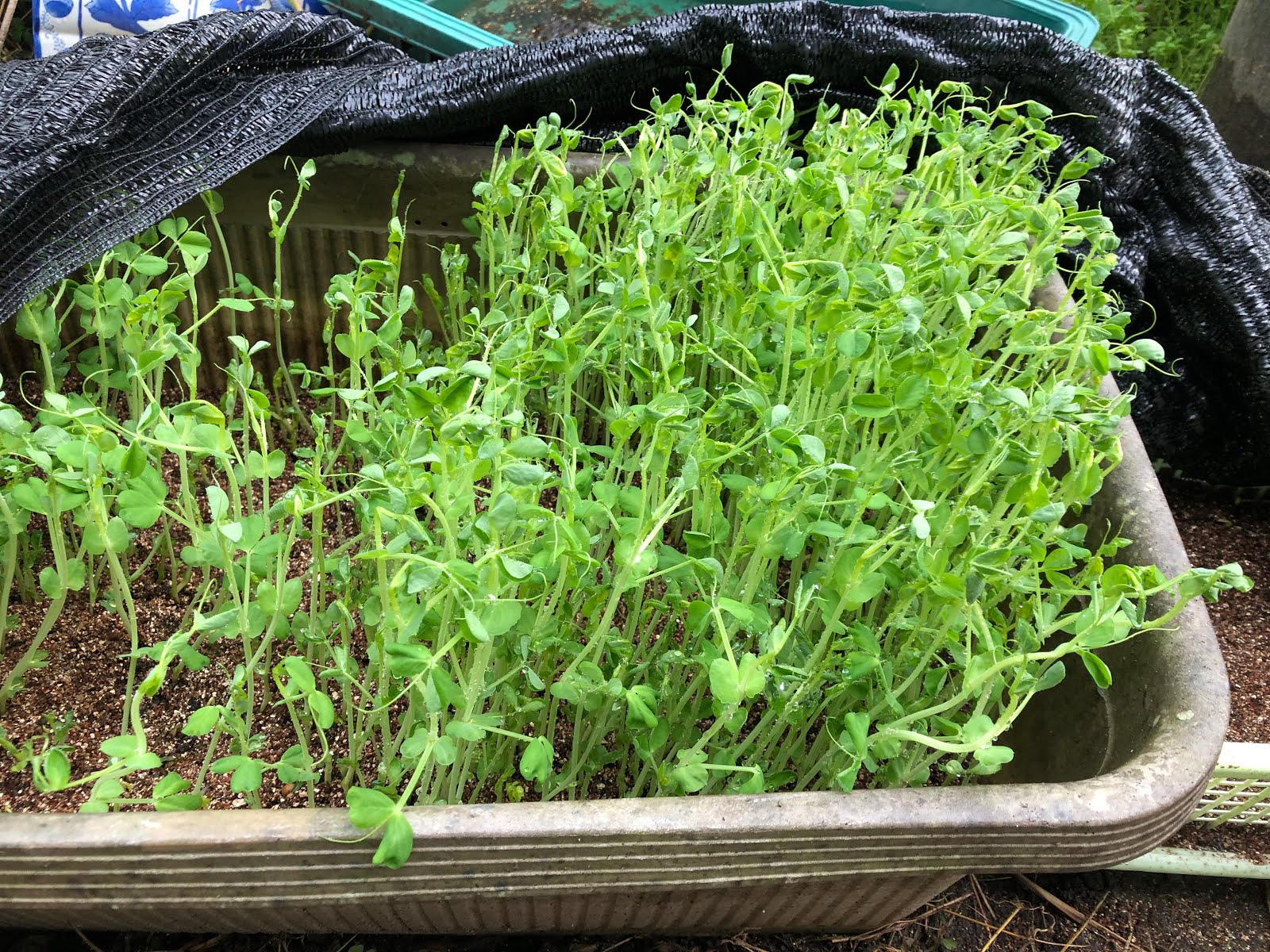 今年豆苗を作る条件は、去年の反省から遮光シートを2重にかけた半日陰だ。