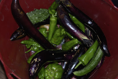 | ナスやピーマンは食べる分を十分収穫できている。 ここにズッキーニが1本も入っていないのが不思議な感じ。 |