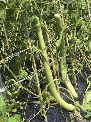| こちらのスネークタイプも1mは超えているみたいだ。 ズッキーニと違って長いズッキーニは豪雨でもそれほど弱っていなかった。 |