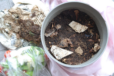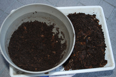 | 右の堆肥がチェック分、左の小さなプランター内にチェックせず残った堆肥がある。残った堆肥のボリュームから判断して投入したとき約800匹いた赤ちゃんは、現在500匹に及ばないのではないかと思われるた。 |
