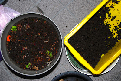 下の写真は新しい餌の入ったプランターに黄色い箱の内容を2/3程戻して混ぜ込んだところ。