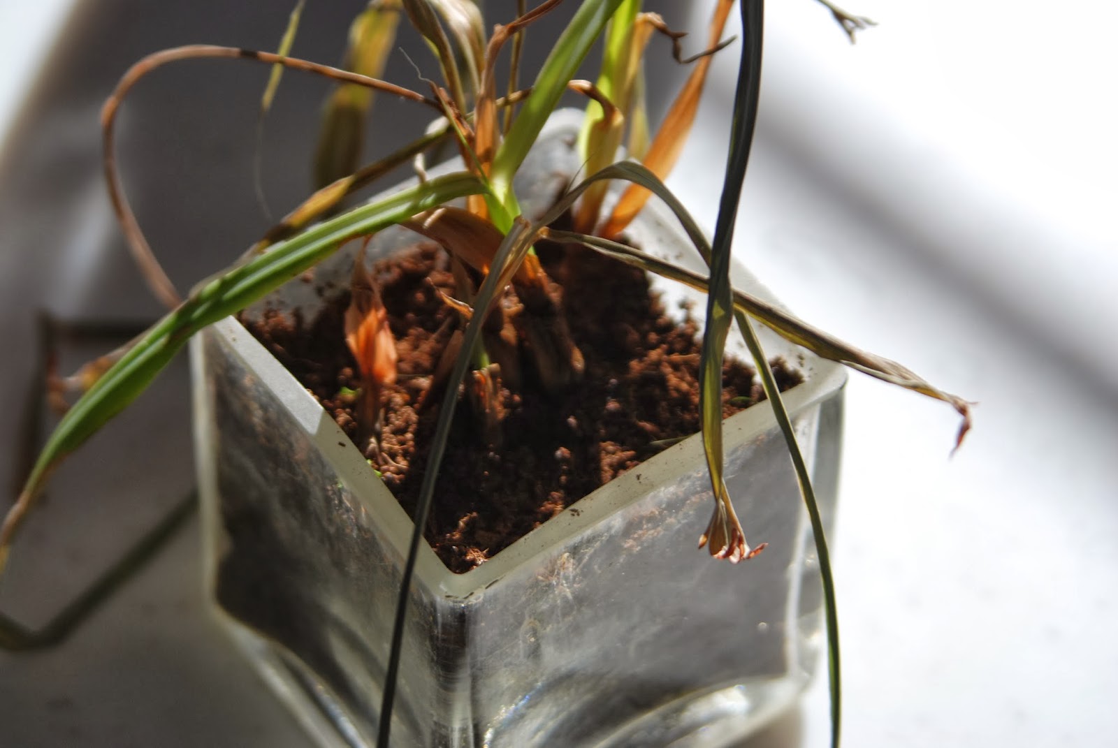 | どんどん葉が枯れ、根も見えなくなった。 そこで、僅かな望みを託してガラス容器にミミズ堆肥を詰め込んだ。 |