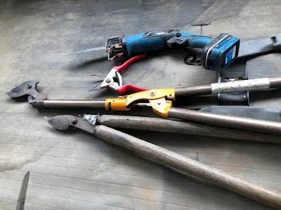 | こちらが、今日の剪定道具。 極端に太い枝は落とさなかったが、それでもノコも使った。 |