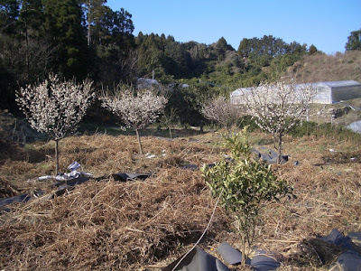 | 初めてこれだけ花が咲いて感激して撮った写真だと思われる。 右から2本目が小梅で、他の3本は大梅だ。 手前に見えている小さなミカンの木は伊予柑だろう。 |