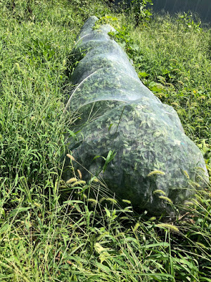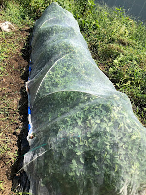 | 落花生の畝の周りは大変な雑草に囲まれている。 しかし、鳥よけ用に掛けている防虫ネットの下では苗が元気そう。 |