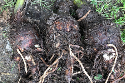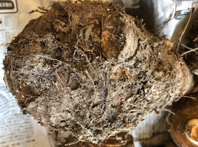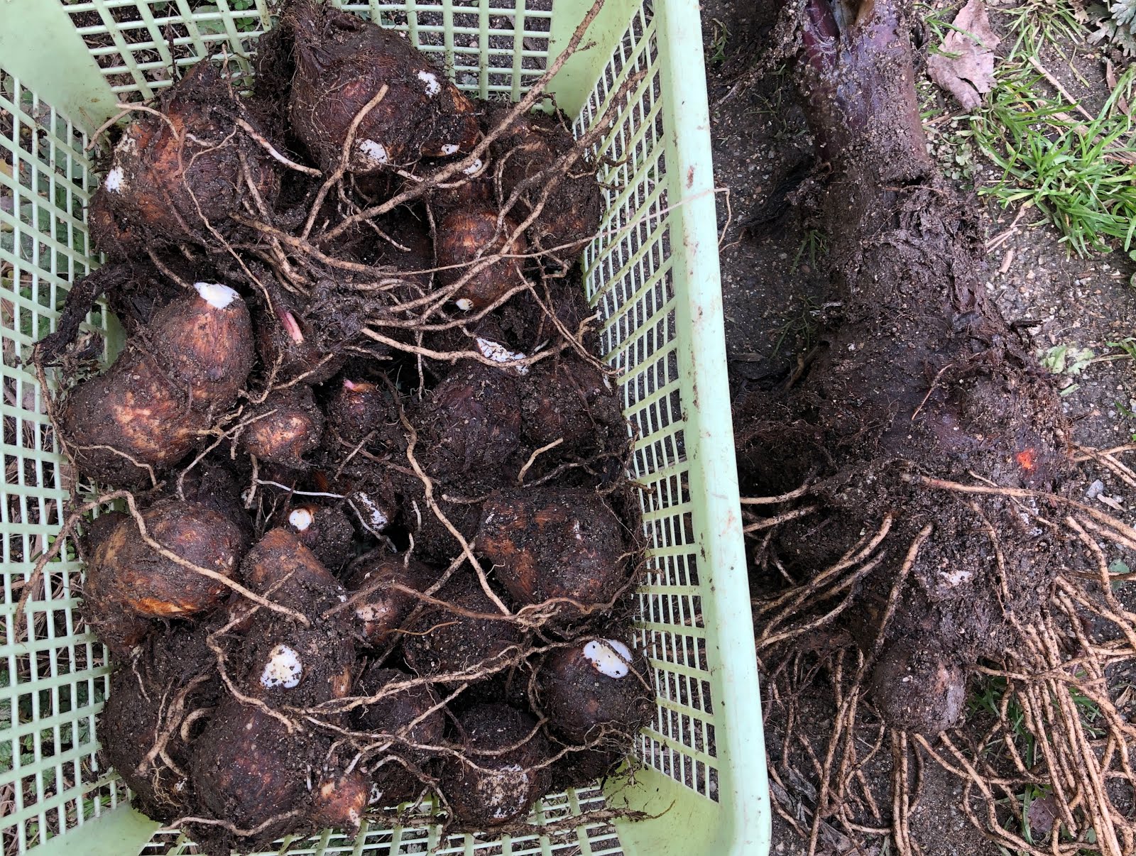 | こちらのあまり美しくない大きな塊はその時に収穫した『黒軸』の親芋。 直径12cmあったので、来年もメインの畝に植えることになる。 |