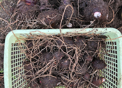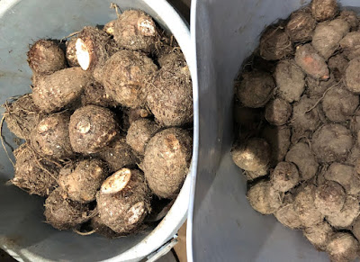 ちなみに、今年ご近所さんから頂いた苗を植えた『赤芽大吉』の株はたくさんあったが、どれも子芋は一株から5~6個と少なかった。