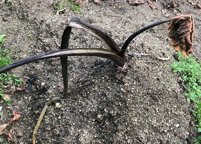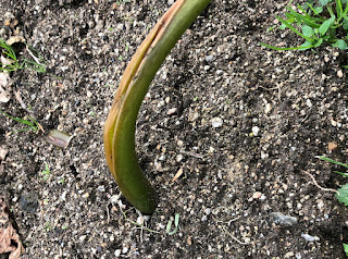| 大きな親芋を逆さ植えするとこんな感じで離れたところに茎葉が育つことが多い 最初芽を出した時よりさらに茎の間の距離が伸びている。 新しくできた親芋もまわりにと多く残芋が収できて株間がひろがったのだろう。 |