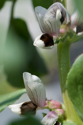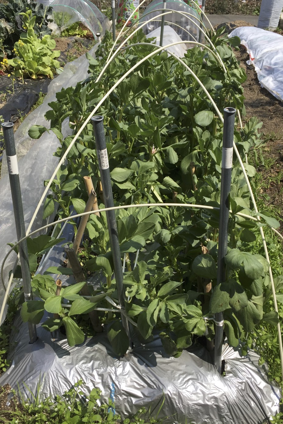 空豆の苗は、2週間ほど前に下の方で枝の誘引固定をしていた。