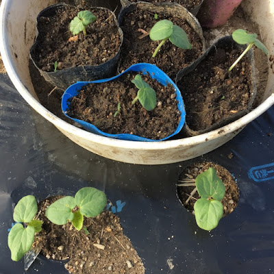 ポット苗はまだ双葉の状態。 直播きでは本葉が出始めているものが多い。育ちの差は日当りの差だろうか? |