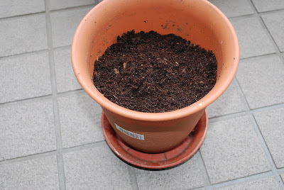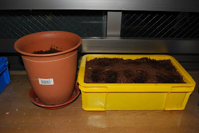 その一個は、里芋の親芋芽だしをおこなっている黄色い箱の横の小さなプランターに入れておいた。