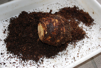 先日、ミミズ堆肥を使って、里芋親芋の上1/4を切って上下逆さまに植えたものの芽だし実験を紹介した。
