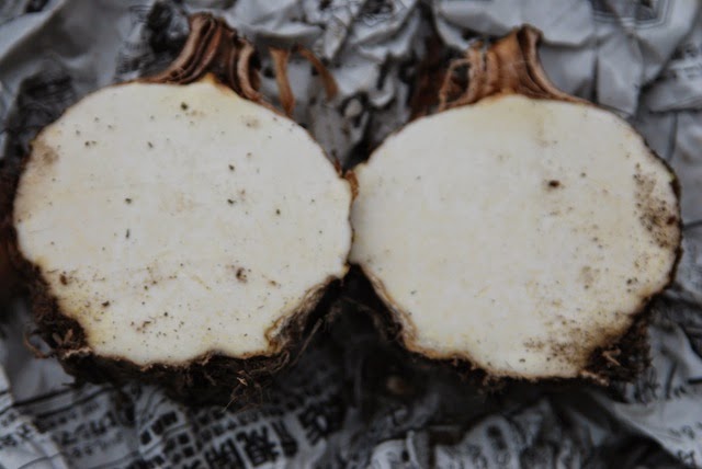 | やや小さめの親芋だ。 外側の乾いた薄皮を剥いでみるとこの親芋が腐れていないことが分かった |