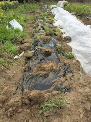 さらに、第2菜園では草取りなどの手がかからないように、最初からマルチに穴を開けて親芋を植えている。