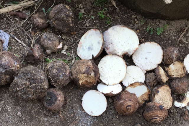 結果的に、早い時期に掘り出した親芋をウェットな状態で土に埋めるやり方が一番問題だったので、来年はどこに保存するにせよ、早い時期に親芋を掘り出した場合は一旦十分乾かしてから保存することにしよう。