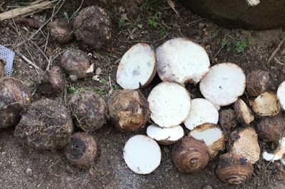 | こちらは逆さ植え用の親芋。 こんな風に頭を切って、そこに木灰を付けてそちらを下にして植える。 |