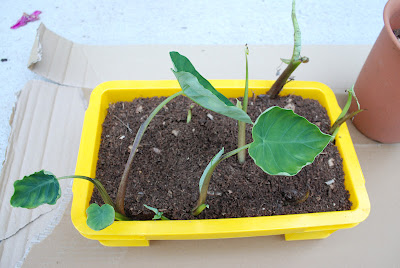 親芋の上1/4をカットして外し、残った親芋を逆さに植えたから。この方法は以前どこかで見かけたブログの中の記載通りにやっている。