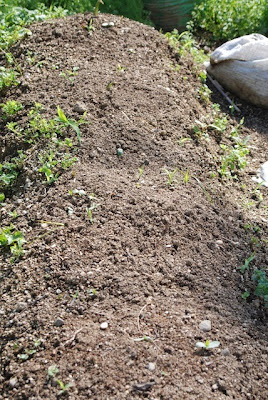 | 芽を出して間もない親芋を順行植えにした里芋。 親芋を逆行植えしたものはまだ芽が出ていない。 |
