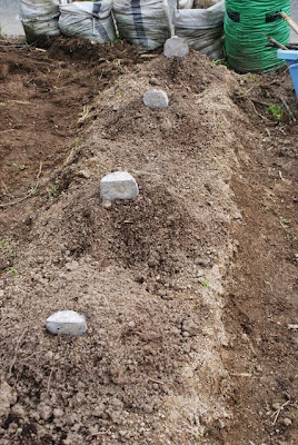 畝の奥から、順方向植えが2個、そして逆さ植えが2個。