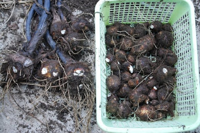 | 今日だけでこれだけ親芋が採れた。 と言うことは、よほど保存に失敗しない限り来年の種芋は十分だ。 |