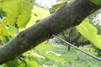 ところで、前にも述べたが、イチジクの木では木屑が落ちているところの上には必ずカミキリムシの幼虫の穴がある。