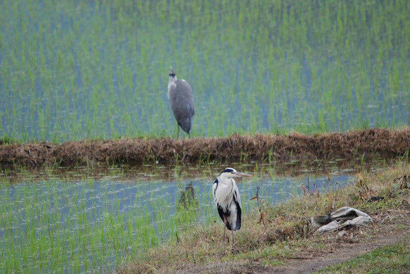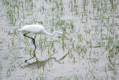一方、シラサギ(ダイサギ)はえさを食べるのに落ち着きなく、水田の中を歩きまわっている。デパートで見かけるどこかのオバサンのようだ。