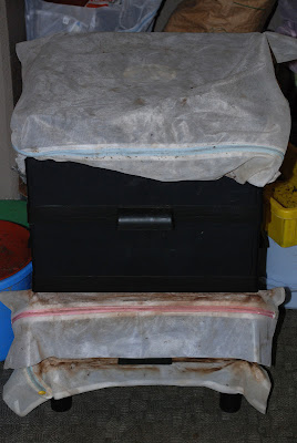 下の写真で、左が元桶(室コン1号)、右上に見えるのは底に敷いてあったネットを外したところ。