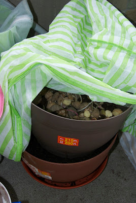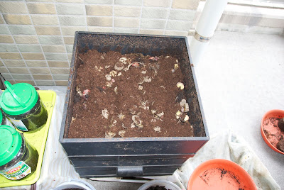 一方、金子の上の段には、網ネットに居た500匹程のミミズを、梅、芋などの餌やココ繊維と共に上の段に入れておいた。