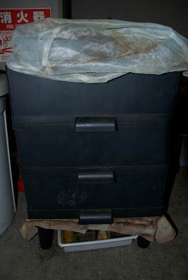 | よく見ると、以前は中段と下段の間に挟んでいた移動予防用のネットが敷いてない。 当然だ。 今回は下段から中段、中段から上段へと多くのミミズ君に移動してもらうはずだったのだから。 ネットは蓋に虫予防で、また下段の下に逃亡予防として敷いているだけだ。 |