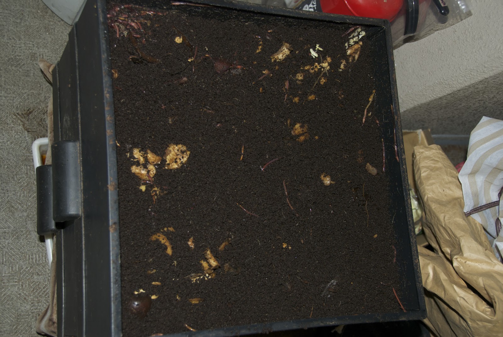 何の問題もない。環境悪化予防にココ繊維を餌の上からかけている。下の方にはかなりのみみず君がいるのは間違いない。