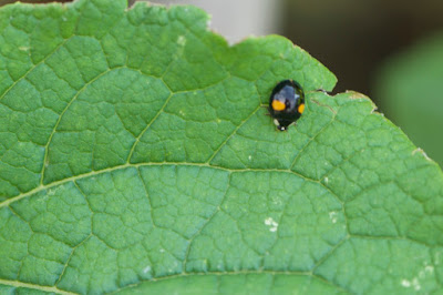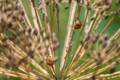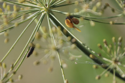 | 相変わらずディルの種のところには、テントウムシもその幼虫もいる。 蛹から丁度羽化が終わった個体は、中羽根が出た状態だ。 |