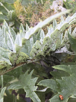 | 虫カゴにはアブラムシもまだたくさん居たが、テントウムシの幼虫もいっぱい居た。 面倒だったのでアブラムシもつけたまま、幾つかのアーティチョークの苗に置いていった。 |