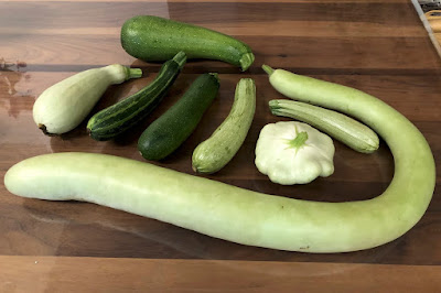 | 他のズッキーニたちと記念撮影。 形に沿って長さを測ると90cmあった。 その食感は冬瓜とそっくりだ。 |
