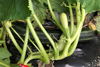 今年、この長いズッキーニはズッキーニの畝の端の方に4本の苗を育てている。