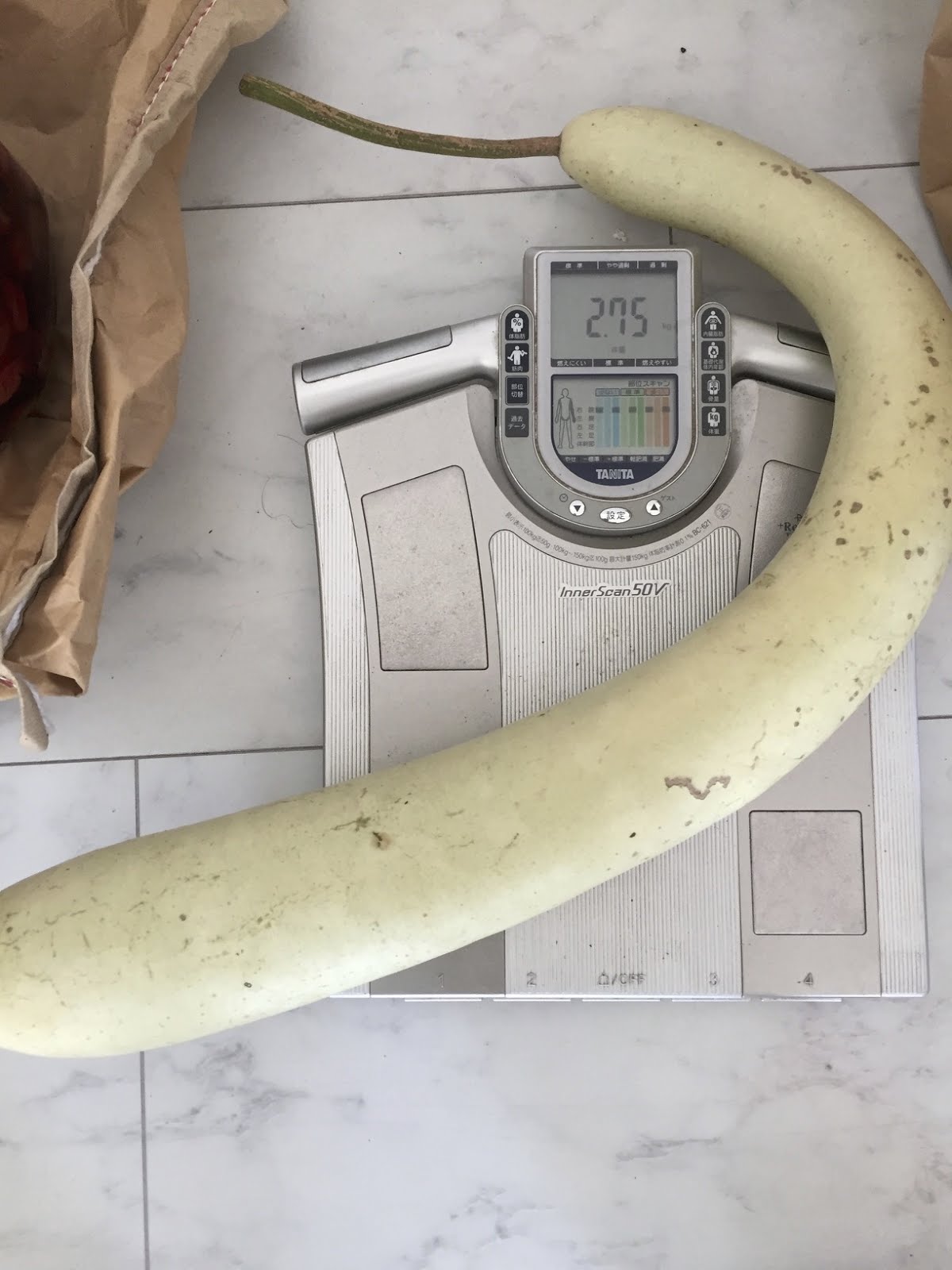 | これが収穫した中で最大の実。 長さ1m10cmで重さは3100gあった。 |