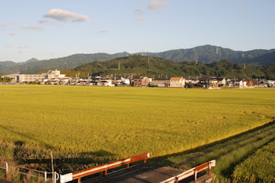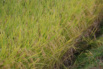 そして夕方になると、秋晴れの下で稲の穂は黄金色に輝いていた。