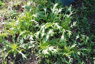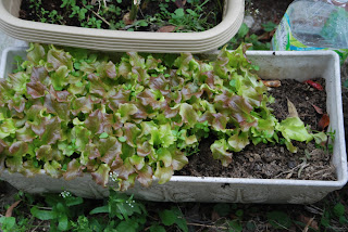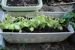 | 奥に見えるのはチンゲンサイの間引き苗 サニーレタスは見るからに弱々しくこれで根付くかどうか不安だった。 |