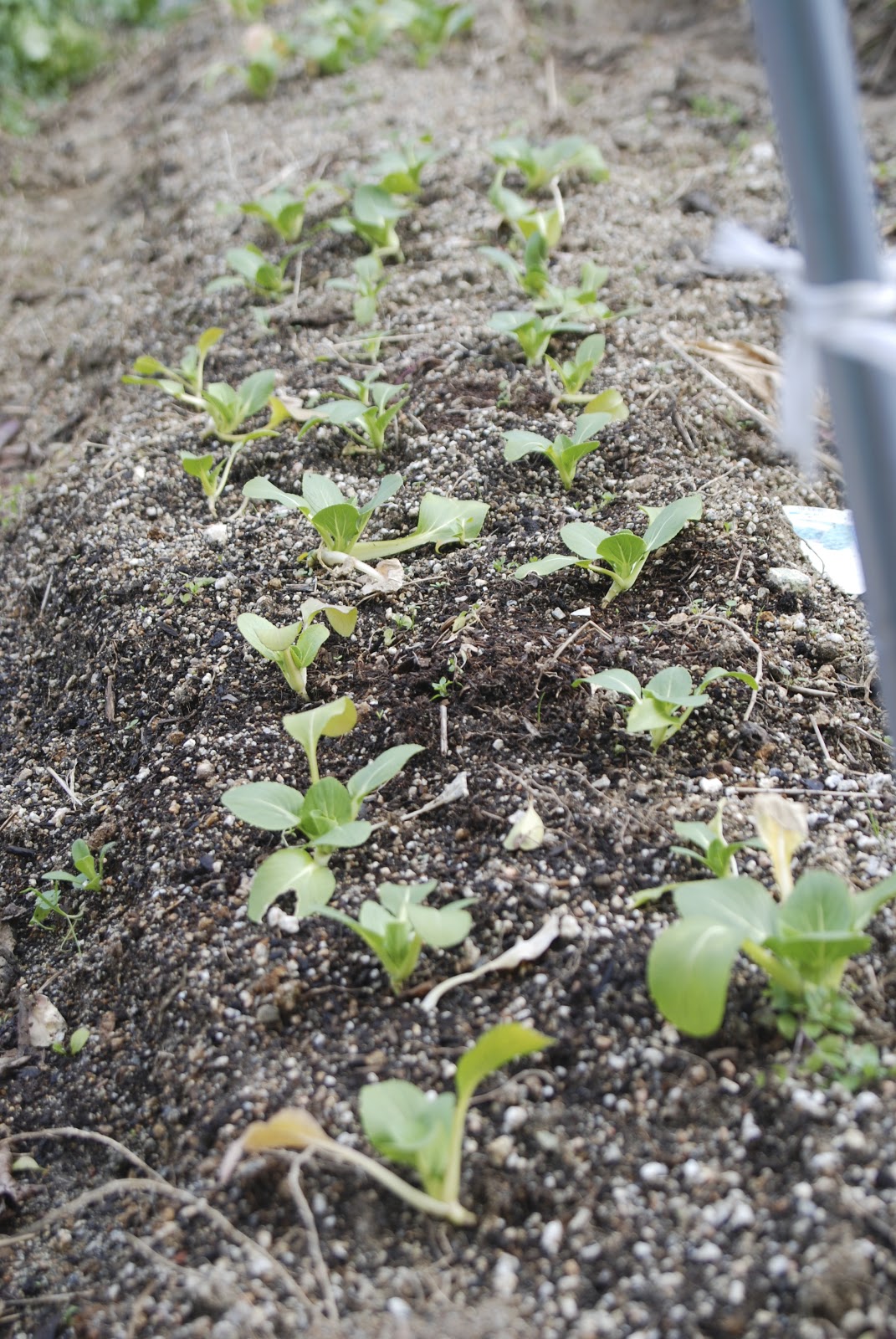 そこで、さらに間引き野菜をいくつかの畝に移植してみた。