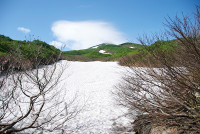 すぐ目の前に雪渓が現れ、慣れない雪渓の上を歩いていった。