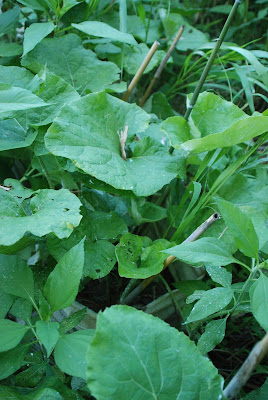 カボチャの苗が伸びるところでは、雑草やキクイモとの競い合い。